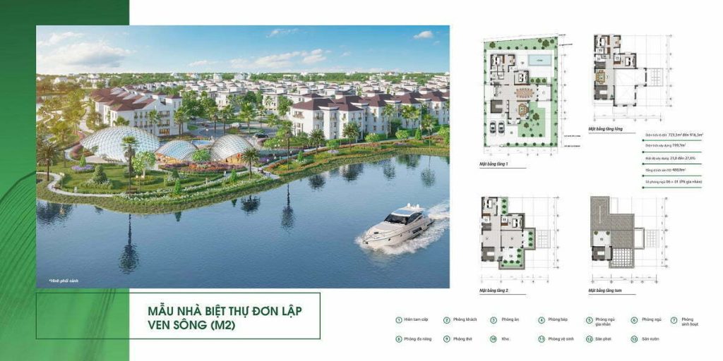 - 165 căn biệt thự đơn lập: Diện tích 350-500 m², xây dựng 2.5 tầng, tổng diện tích sàn khoảng 344,1 m², 5 phòng ngủ + 1 phòng gia nhân.